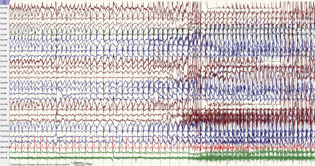 在这里,我们现在详细video-EEG广义发作类型的文档,我们称之为ABTC发作。这种奇特的发作曾被描述由几个作者,4,- - - - - -,7但系统electroclinical文档(视频和EEG)在一群病人缺乏。癫痫的初始阶段由受损的电记录的关联意识的广义脉冲峰值或polyspike和慢波,广义的标志nonmotor(缺席)癫痫发作。2,5,8这些直接进化到主音和阵挛性的活动没有干涉基线发作状态。