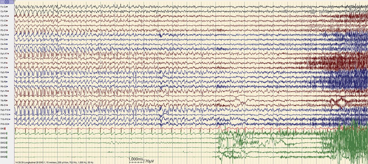 6频道在绿色表面EMG记录从左和右三角肌(EMG 1/2),肱二头肌(EMG 3/4),以及前胫骨(EMG 5/6)的肌肉。广义棘波爆发逐渐取代进化猝发的节奏(低烈度快速活动)。ABTC = absence-to-bilateral-tonic-clonic。