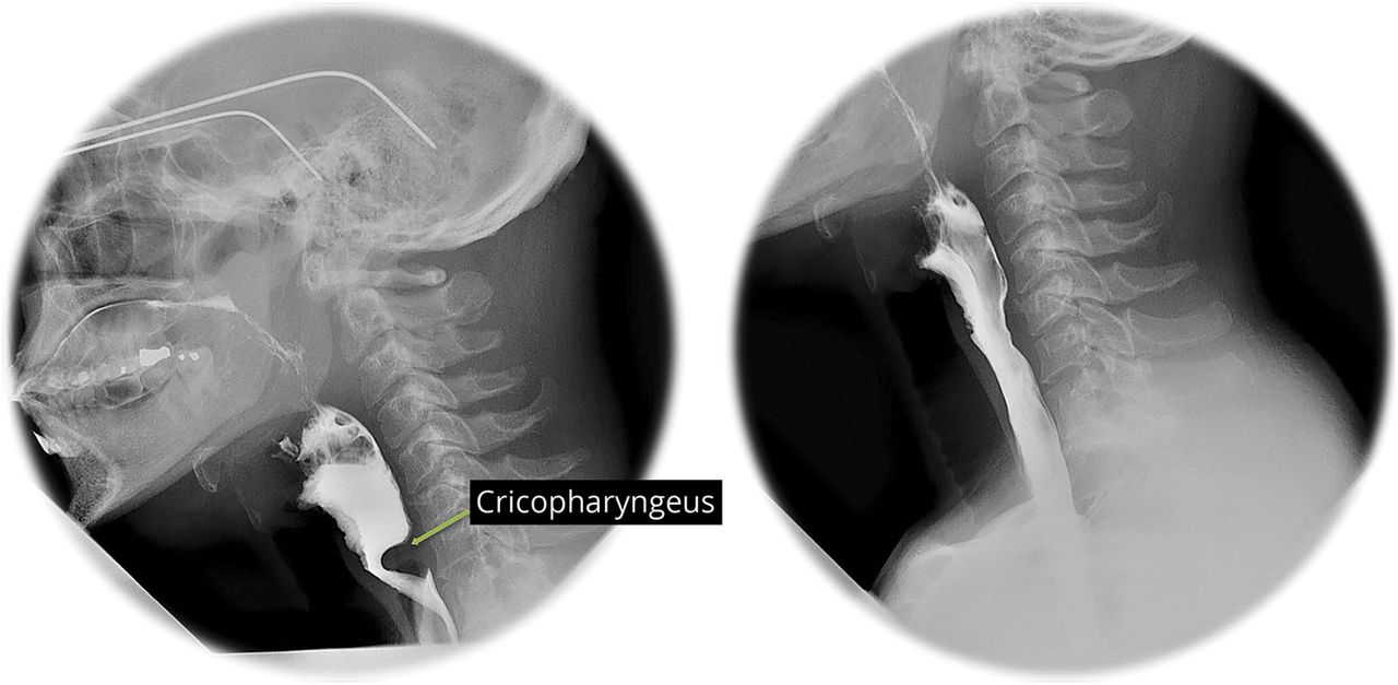cricopharyngeus video-swallow钡显示显著突出,涵盖超过一半的腔的直径(左),显著改善后环咽的肌切开术(右)。