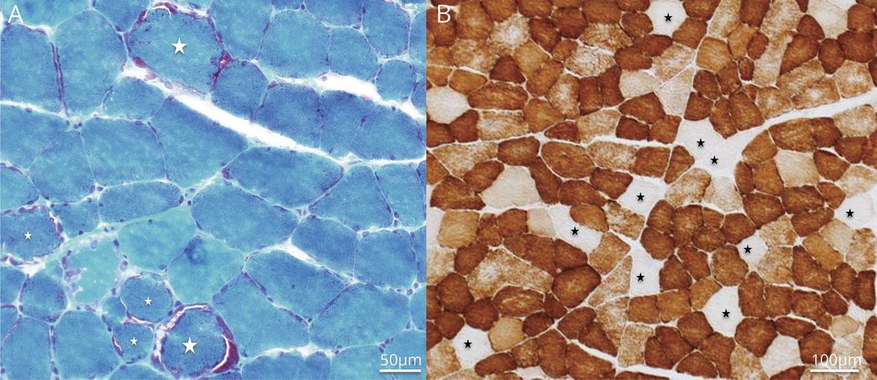 一个40岁的男人面对慢慢进步的软弱和眼睑droopiness。他30出头开始出现症状,增加疲劳与发挥。30年代中期,他开发了下垂的眼睑无复视。大约3年前,他开始进行性吞咽困难,最初与固体和液体与固体食物,但后来的一致性。他还报道了食物卡在喉咙。他被治疗吸入性肺炎。一年之后,他注意到慢慢进步的把手和近端肢体无力影响下肢,描述为困难拿着平板电脑在教堂,经常把对象从他的手,在从一个坐着的位置站起来和困难。最近,他开始在用力时出现呼吸困难和轻度端坐呼吸。他偶尔有经验的视物模糊没有复视,轻微的落差,嘶哑的声音,主要是对一天结束的时候或者当他累了。他被诊断出患有血清反应阴性的重症肌无力在当地设施,与消极的乙酰胆碱受体,阳性激酶,低密度脂蛋白受体相关蛋白4抗体。 His medical and social history were otherwise unremarkable. The patient's father was French Canadian. The patient also had Native American and African American ancestry. There was no family history of myopathy or any neuromuscular disorder. Neurologic examination was significant for moderate bilateral ptosis, bilateral ophthalmoparesis with limited upward gaze and to a lesser extent horizontal gaze (both eye abduction and adduction), mild weakness of both upper and lower facial muscles, moderate weakness of the proximal lower extremities most prominent at the hip abductors (Medical Research Council [MRC] grade 3 to 4-/5), and mild (MRC grade 4) weakness of finger extensors and intrinsic hand muscles. He had no demonstrable fatigable weakness on examination in any of the affected muscles. He had a mildly waddling gait and absent ankle jerks bilaterally. Sensory and coordination evaluations were unremarkable.