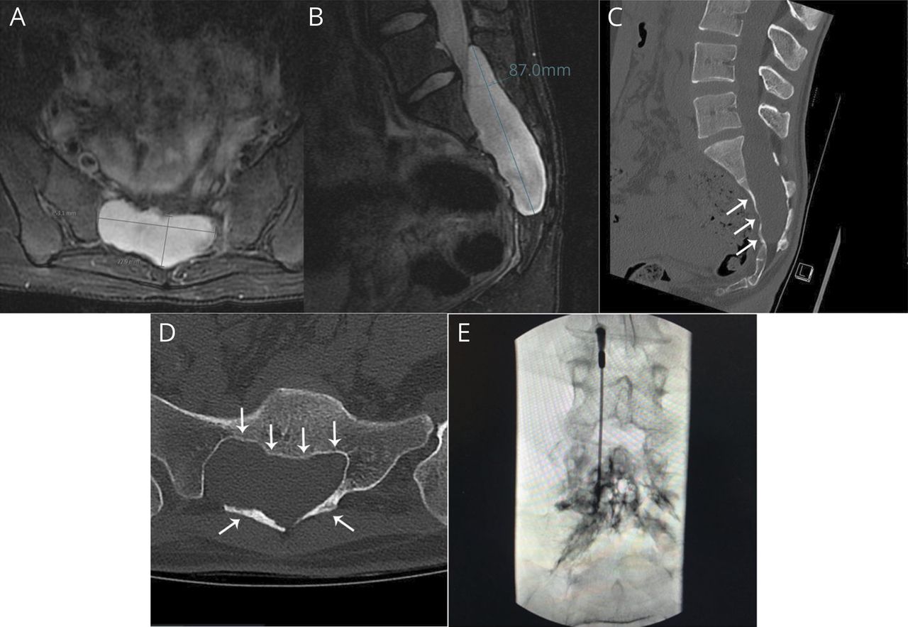 很难区分这两种类型的囊肿或确定位置(硬膜内的或硬膜外的)仅通过核磁共振。CT或磁共振(MR)脊髓x光像可以提供更多的信息。在我们的例子中,一个硬脑膜的缺陷在手术过程中被确认。这是造成脑脊液漏,在骶管形成一个集合。集合的大小是实质性的和骨重建了(图中,C和D),这可能占我们的病人的背部疼痛。这一发现具有治疗意义为骶集合或囊肿症状有时通过排水管理。金宝搏188手机app在我们的例子中,这可能导致恶化的症状进一步降低脑脊液压力和复发的液体收集在一个未经处理的硬脑膜的缺陷。3,5
