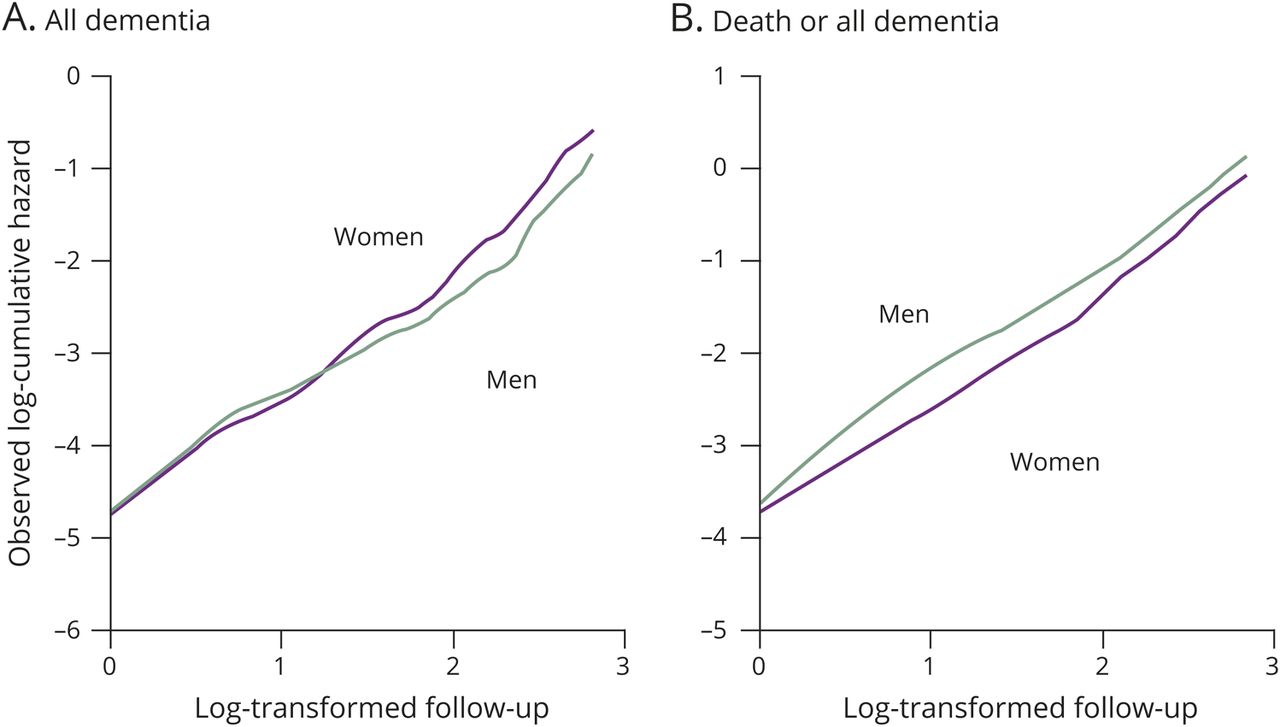 软件包SAS(版本9.4;SAS研究所卡里,NC)被用来执行所有统计分析。痴呆及其亚型的累积发病率计算考虑到竞争的存在死亡的风险(图e 1中,doi.org/10.5061/dryad.d8v1b44)。32首先,我们估计死亡——和所有dementia-free生存概率,以及所有dementia-free生存概率在随访中通过使用一般的kaplan meier方法,然后生成的累积风险情节为了检查生存概率的分布。块对数转换累积危害与对数转换随访时间像直线性(图1),这表明威布尔分布是适合生存时间的分布对这些端点。因此,我们建立了一个函数来描述死亡,所有dementia-free生存(eS [t]),和一个函数来描述所有痴呆(或每个痴呆亚型)无生存(eS′[t])利用威布尔比例风险模型,其中t是数年的随访。参与者的风险的数量每年随访(eN [t])计算eN (t) = eN (0)×(t)。累积风险函数(电解珩磨′[t])和风险函数(呃′[t])事件的痴呆(或每个痴呆亚型)被计算为电解珩磨′(t) =−日志(eS′[t])和嗯′(t) =电解珩磨′(t)−电解珩磨′(t−1),分别。这些函数的基础上,所有痴呆或痴呆的累积发病率亚型(单位:百分比)在每年估计eCI (t) =∑(eN (t−1)×呃′[t]) / N (0)×100。观察和估计累积发病率之间的协议是评估使用一个单向随机一组内相关系数的措施。33痴呆的风险估计寿命(或每个痴呆亚型)被定义为估计累积发病率相关的端点的年参与者风险的估计频率达不到0.5%。3495%的置信区间(CIs)的估计累积发病率估计从1000年引导样品。