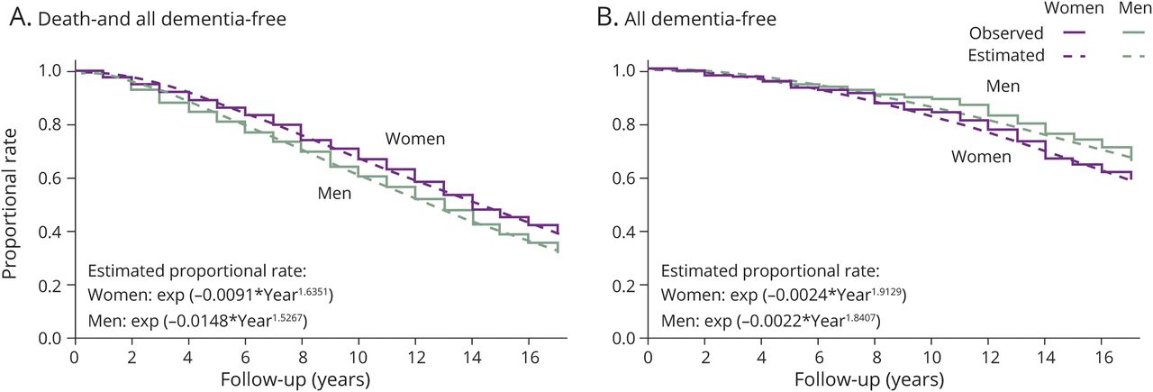 (一)死亡-和所有dementia-free生存。(B)所有dementia-free生存。0代表了时间的起始跟踪(基线调查)。