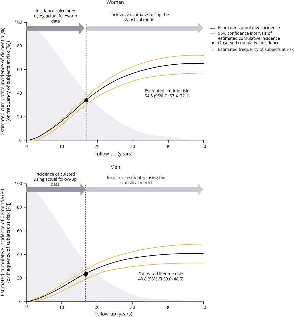 估计的剩余寿命痴呆的风险被定义为所有痴呆的累积发病率估计这些年来的后续参与者风险的估计频率达到了不到0.5%。0代表了时间的起始跟踪(基线调查)。CI =置信区间。