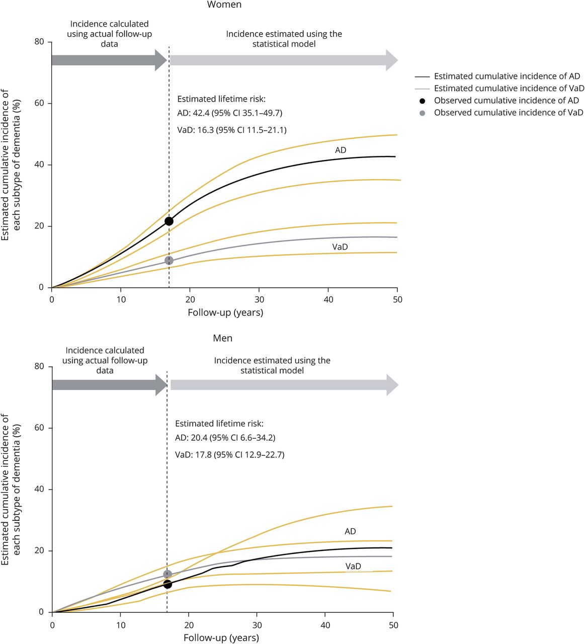 结果在随访期间,350名参与者经历了某种类型的痴呆;其中,191名参与者发达发达血管性痴呆阿尔茨海默病(AD)和117年(VaD)。一生患上痴呆的风险为55%(95%的置信区间,49% -60%)。女人有大约1.5倍的一生中患上痴呆的风险比男性(65%(57% - -72%)和41% (33% - -49%))。开发广告和VaD的终生风险是42%(35% - -50%)和16%(12% - -21%)的女性和20%(7% - -34%)和18%(13% - -23%),男性,分别。