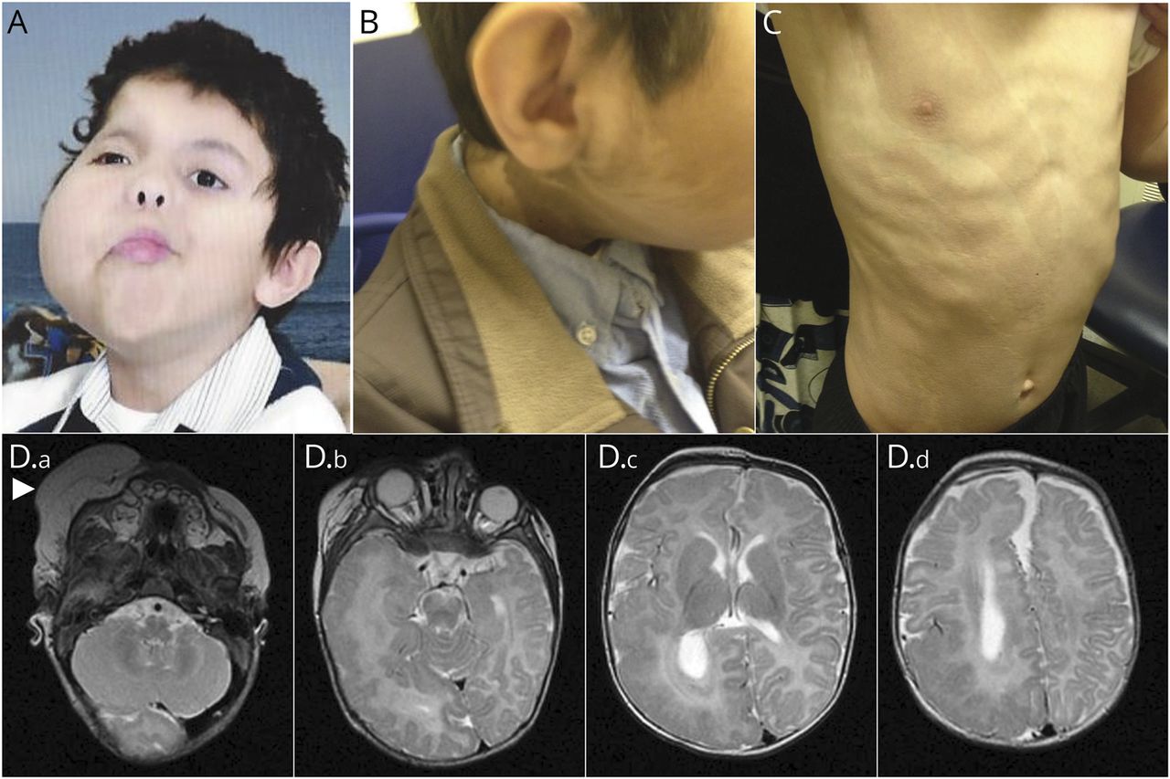 (一)正确的半面生长在我们的丁香综合症患者。(B)表皮痣右侧面部和颈部。(C)表皮痣在树干上,表现为色素沉着过度和表皮增厚,遵循Blaschko线条和显示一个潜在的体细胞突变的存在。大脑(D.a-D.d)轴向1.5 t MRI岁2个月显示hemimegalencephaly,右心室扩大,和广泛的右颞皮质发育不良,顶叶和枕叶。有灰白色的模糊边界和polymicrogyric的皮层。注意正确的脸(箭头)的脂肪瘤的过度生长(地方检察官)。丁香=先天性血管脂肪瘤的过度生长,表皮,骨骼和脊柱异常。