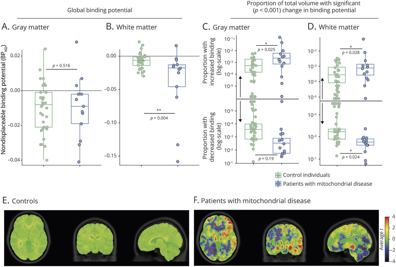 (A, B)全球(11C] P188金宝慱官网下载K11195 nondisplaceable绑定(BP的潜力ND灰质)在(A)或(B)白质为每个控制(绿色)和线粒体疾病患者(蓝色)。(C, D)分数的体素(C)灰质和白质(D)为每个单独的控制(绿色)或线粒体疾病组(蓝色),英国石油公司ND明显不同(p< 0.001)控制人口的体素的水平。轴是对数转换。p值模拟计算了年龄,sex-corrected线性回归。个人(E, F)的平均水平T统计地图(E)控制和(F)患者线粒体疾病控制队列相比,覆盖152年洲际弹道导弹2009 T1 MRI模板。