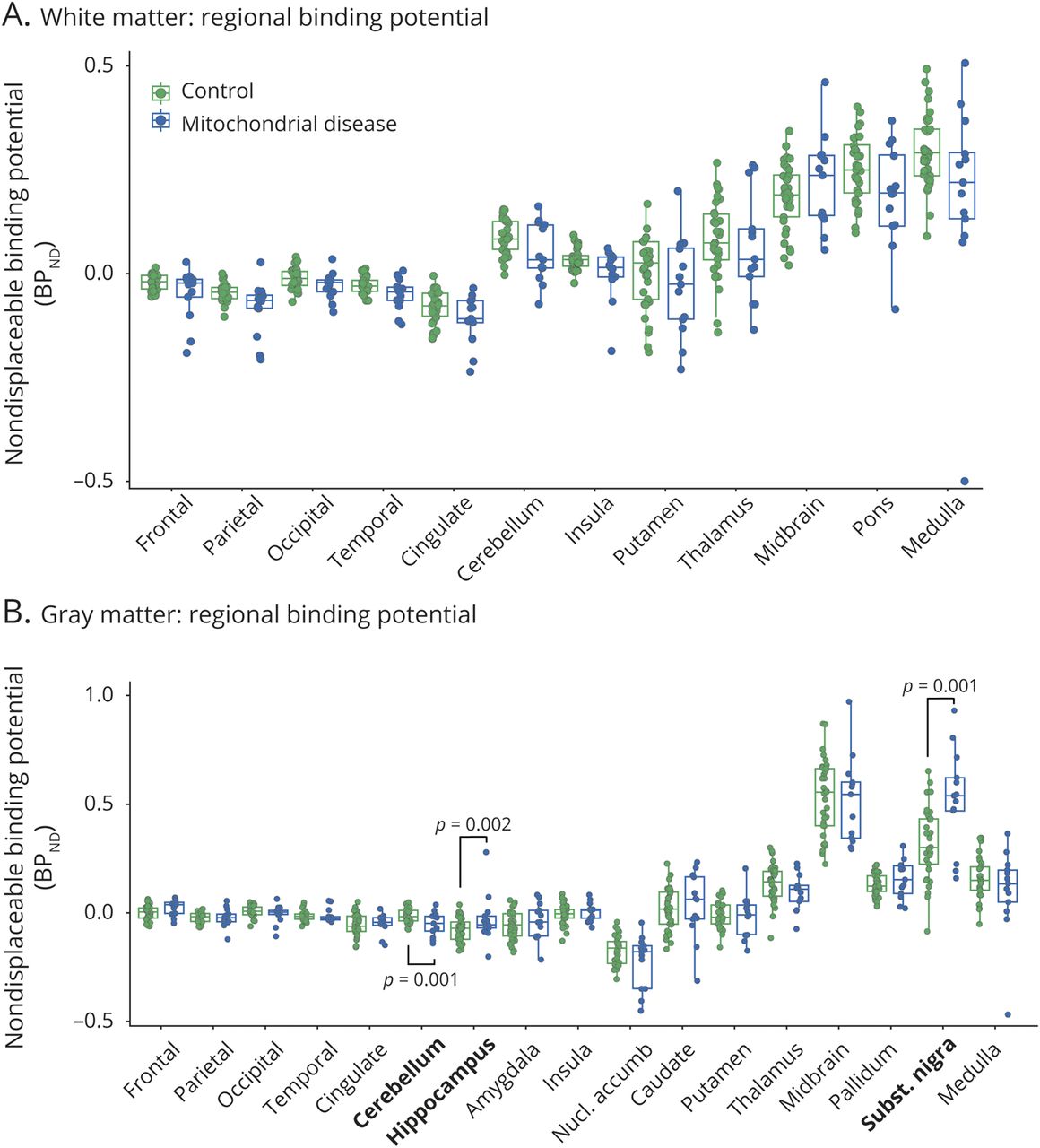 我们比较放射性示踪剂绑定特性之间的整个大脑灰质和白质病人和控制。在灰质,全球的英国石油公司ND两组之间的比较(p= 0.516),大多数患者在控制范围内下降的值(图1一个)。相比之下,在白质,全球的英国石油公司ND线粒体疾病患者低于在控件(p= 0.004),主要是由大量减少在英国石油公司ND在2或3的患者(图1 b;见下文)。