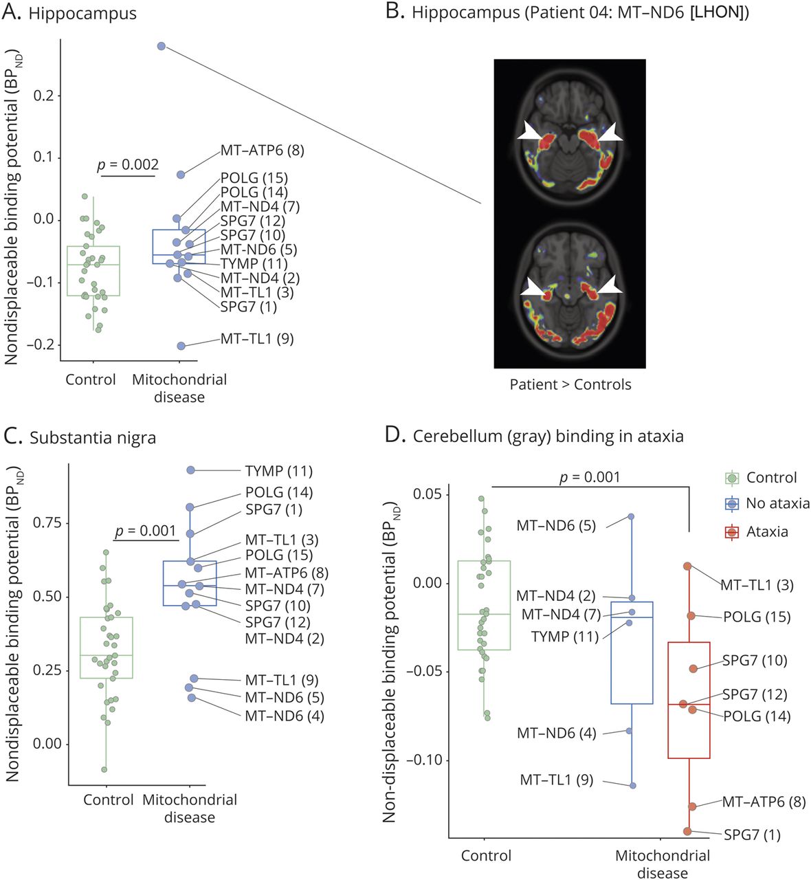 我们检查是否显著差异观察小脑灰质,海马,黑质是由特定的突变或临床特征(图3)。最引人注目的例外与伯世袭视神经病变患者4 (LHON)和周围神经病变MT-ND6m。14484T>C mutation, where we observed a strong increase in binding in both hippocampi (图3中,A和B)。这个病人有广义脑萎缩MRI的报道,但没有临床症状或体征提示海马功能障碍(表)。增加了英国石油公司ND黑质中的值(图3 c)也没有与帕金森症的存在或其他锥体外系症状(表),尽管这些症状在线粒体疾病临床表现的一部分。29日