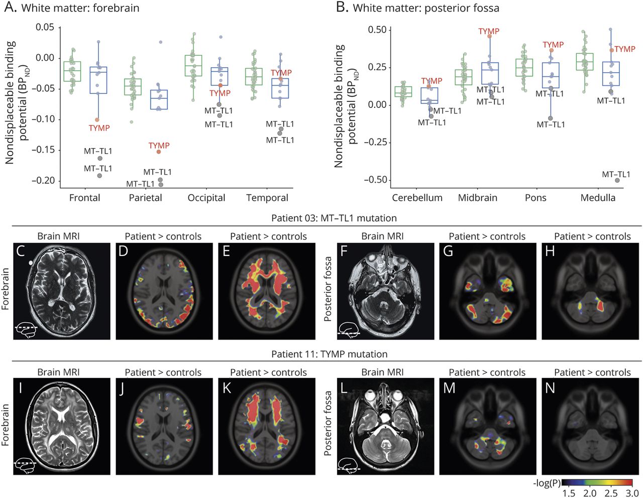 (A, B) [11C] P188金宝慱官网下载K11195 nondisplaceable绑定(BP的潜力ND)表示的白质区域利益的前脑(A)和(B)颅后窝控制(绿色)或线粒体疾病患者(蓝色)。点从病人3、9 (MT-TL1突变,灰色),11 (TYMP突变,红色突出显示)。(氮)覆盖在洲际弹道导弹上152−2009 T1 MRI模板日志10(p的体素值)明显增加(病人>控件;D J, G, M)或减少(病人<控件;E、K H, N)英国石油公司ND(p< 0.05;p≤0.001红色的)大脑半球(D, E, J, K)和颅后窝(G H, M, N),连同相应的MRI T2 (C、F I, L)对患者3和11所示。