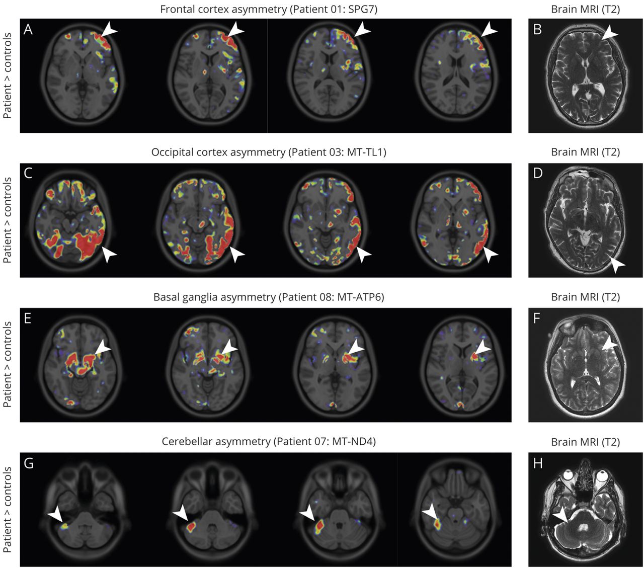 许多(11C] P188金宝慱官网下载K11195宠物画面显示不对称信号改变大脑的特定区域(图5),没有明显的对应相应的MRI异常。最明显的例子不对称的放射性示踪剂绑定在大脑皮层(额叶皮层在病人1SPG7突变;枕叶皮质区和一个病人3MT-TL1突变;图5 A和C),基底神经节(病人8,MT-ATP6突变;图5 e7)或小脑(患者MT-ND4突变;图5克)。不对称信号变化不明确相关临床表现,在图中以增加信号的对侧小脑半球LHON患者(患者7;图5克)否则无症状(表)。