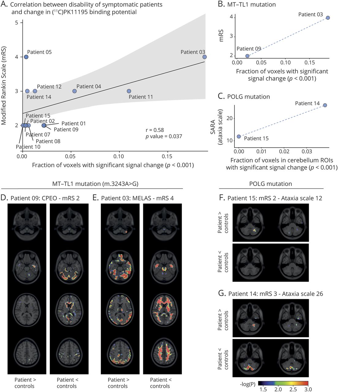 (两者之间的相关性分数(A, B)改良Rankin量表(夫人)或(C)量表评估和评级的共济失调(SARA)和大脑的一部分(A和B)或小脑(C) nondisplaceable绑定(BP的潜力ND)显著(p< 0.001)不同于控制人口对所有13线粒体疾病患者症状(一个;r0.58;p值0.037)或只对那些病人MT-TL1(B)或POLG(C)突变。(d)覆盖−日志10(p值)的体素显著增加(病人>控制)或减少(病人<控制)(11C] P188金宝慱官网下载K11195英国石油公司ND(p< 0.05;p≤0.001在洲际弹道导弹上红色)152 2009 T1 MRI大脑模板在正则背腹间隔(D和E)或在小脑(F和G)。ROI =感兴趣的地区。
