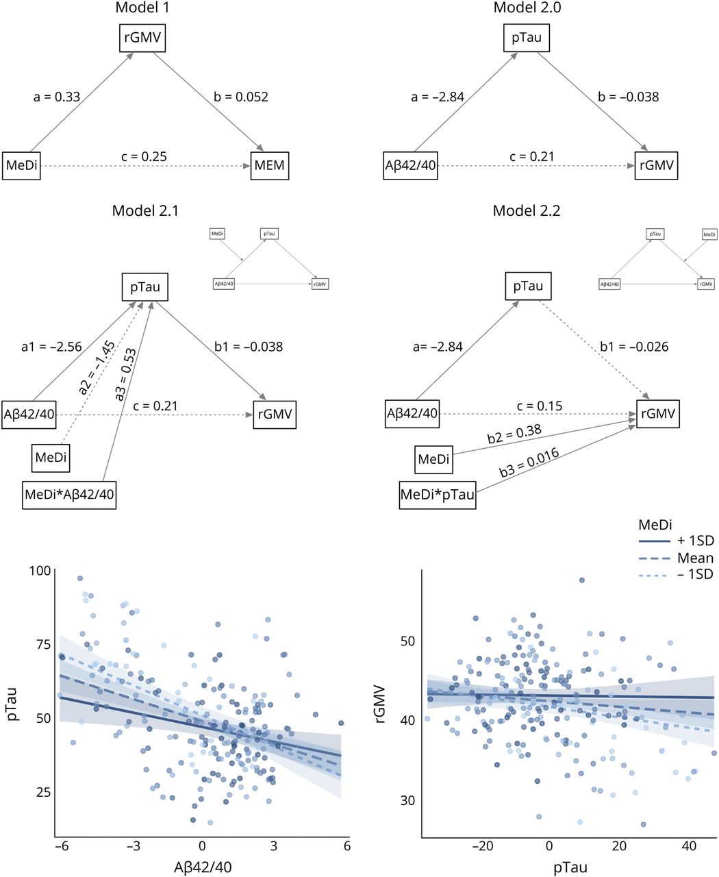 的路径名称和相关回归估计报告。实线代表重要路径根据置信区间与偏差纠正引导10000复制生成的。虚线标记无意义的回归的路径。2.1和2.2的模型,除了统计模型,概念模型显示在右上角的角落,和简单斜坡代表的交互效果如下所示。直接和间接影响的完整概述报告表4。Aβ42/40=比率β-amyloid42和β-amyloid40;读出=地中海饮食;MEM =记忆总结因素得分;pTau =磷酸化τ;rGMV =双边海马和parahippocampi区域灰质体积。