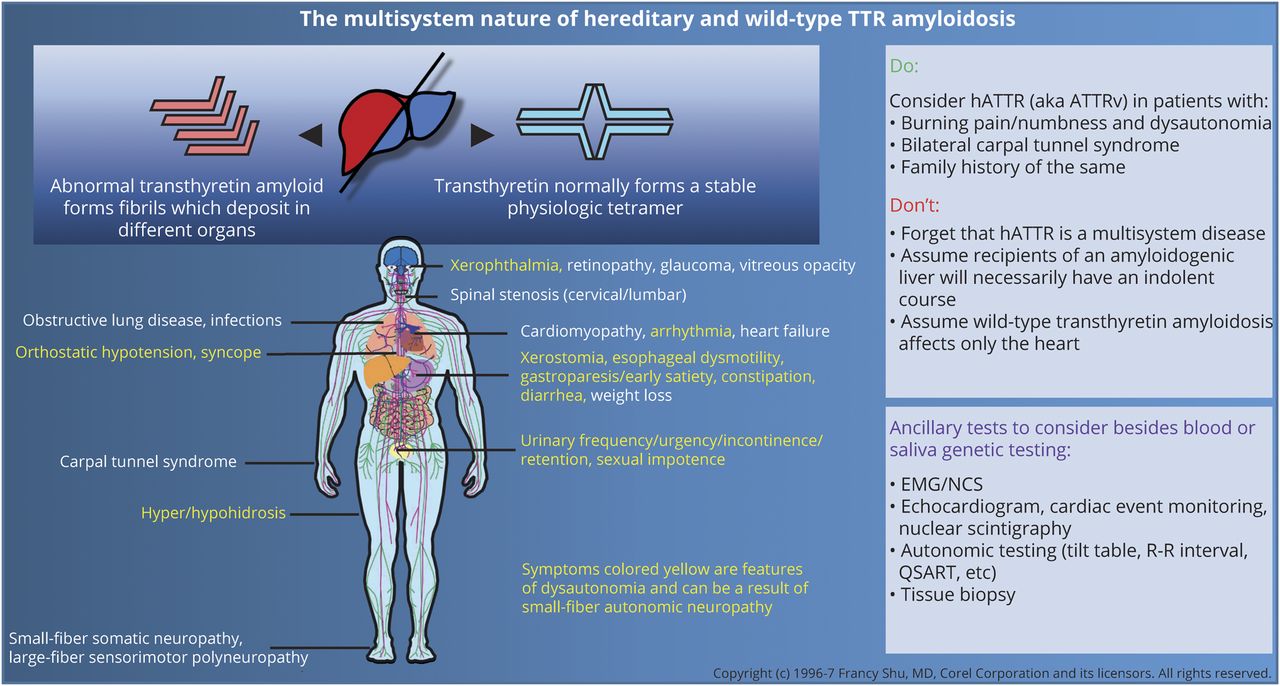 遗传性转体基因淀粉样变(hATTR)是一种常染色体显性遗传,迅速进步,多系统疾病,大量的临床异质性,通常在周围神经系统的病变(正中神经病变、感觉运动多神经病small-fiber躯体神经和自主神经病变)和心血管系统。