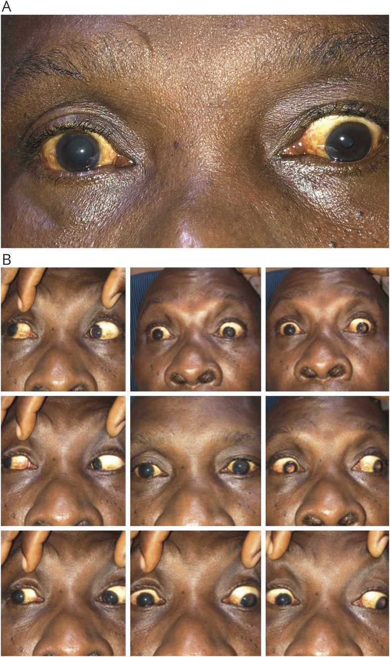 如在图1一个,双眼上眼睑内缩(左>右),粗斜视(右瞳孔7mm,左瞳孔3mm)。右瞳孔对直接或一致的光反应和尝试收敛没有反应。左眼严重屈光度下降20棱镜(图1一个).双眼完全上视麻痹,不对称下视麻痹(右眼>左眼),右眼内收轻微受限(图1 b).