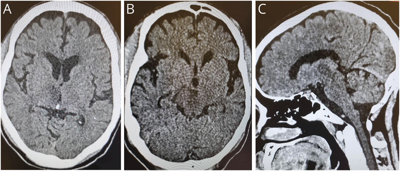头部CT扫描显示右丘脑局灶性低密度,提示梗死,包括其靠近第三脑室壁的内侧部分,如轴向切片所示(图2一个),并延伸至中脑的嘴侧部,见四叉神经池水平的轴向切面(图2 b)和矢状面(图2 c).
