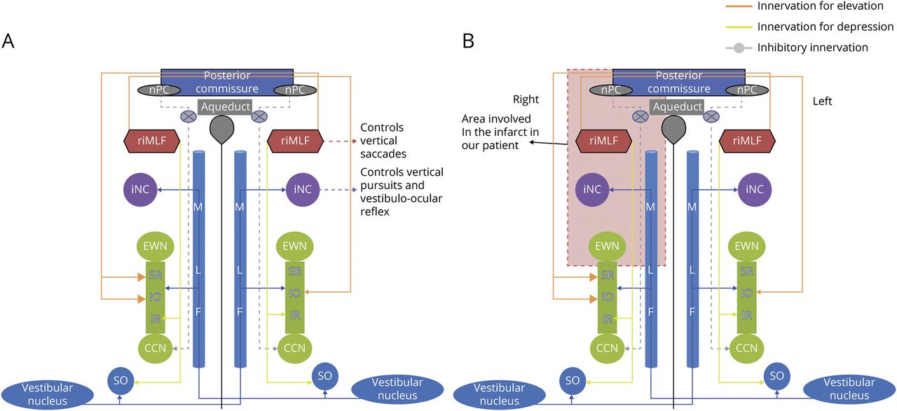 (A)垂直注视中心,它们的功能和联系。(B)本例中受梗死影响的区域。CCN =中央尾核;EWN =埃丁格-韦斯特法尔核;iNC = Cajal间质核;IO =下斜肌;IR =下直肌;后连合核;riMLF =内侧纵束口侧间质核;SO =上斜肌; SR = superior rectus.