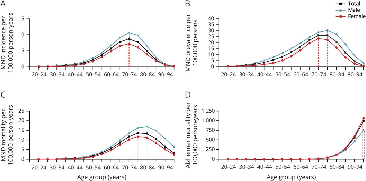 该面板图显示了1998年至2017年通过泊松回归确定的荷兰运动神经元病(MND)发病率(A)、患病率(B)、死亡率(C)和阿尔茨海默病死亡率(D)。虚线表示费率最高的年龄组。男性和女性的年龄对发病率有不同的影响(p相互作用项< 0.01),患病率和死亡率(两者均为0.01)p< 0.001)。例如,男性MND患病率和死亡率最高的年龄比女性大。相比之下,老年痴呆症死亡率最高的年龄组(95岁)无论男性还是女性。这表明MND风险不仅仅是衰老的结果。根据荷兰MND登记处的数据确定了年龄和性别分层的MND发病率。使用荷兰MND登记处和荷兰神经肌肉疾病患者协会的数据,采用捕获-再捕获方法确定MND患病率。MND死亡率和阿尔茨海默病死亡率由荷兰个人记录数据库中的死亡率记录确定。