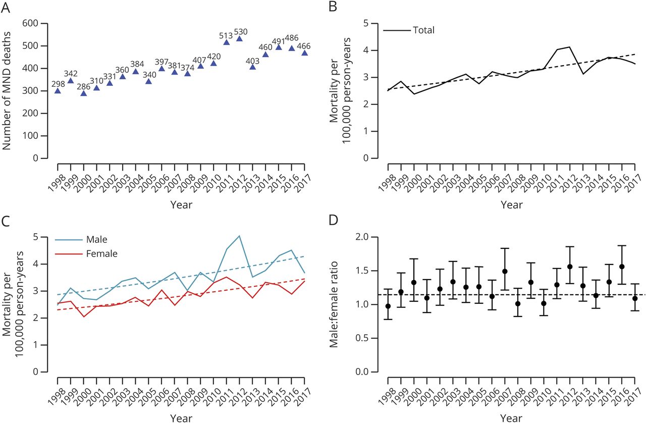 (A) 1998年至2017年期间在荷兰观察到的运动神经元疾病(MND)死亡人数。MND死亡的绝对人数从1998年的299人增加到2017年的466人,平均每年增长2.6%。(B)根据人口规模调整后,死亡率增加了53.2%,在年龄和性别调整后,死亡率增加了14.1%p< 0.001),虚线表示回归线。(C) MND死亡率分别为男性(蓝色)和女性(红色)。男性和女性MND死亡率的年增长没有差异(p交互项= 0.62)。(D)与面板C相似,我们提供了年度男女比例,揭示了长期稳定的性别比例为1.19(虚线)(p时间趋势= 0.09)。