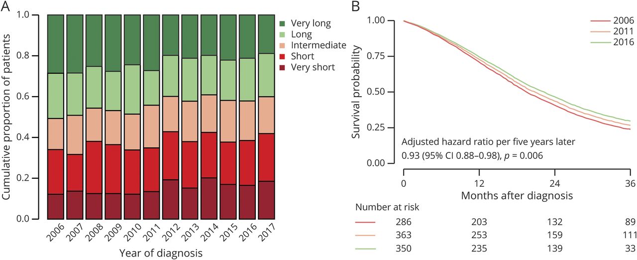 (A)欧洲ALS治愈网络(ENCALS)个性化预测模型定义的5个预后亚组的年度分布。理想情况下,每个预后亚组的患病率应≈20%/年。可以看出,2006年,荷兰运动神经元病(MND)登记登记了相对较多的长寿和长寿患者,表明登记登记登记的主要是流行病例。幸运的是,随着征聘战略的改进,寿命较短和极短的子群体也得到登记,荷兰国防部的登记已变得更多地以人口为基础。(B)根据ENCALS风险预测调整Cox比例风险模型,对诊断年份对生存时间的影响进行建模。2006年至2017年随访期间的死亡风险降低了16.2%(每5年风险比0.93,95%可信区间[CI] 0.88-0.98,p= 0.006)。调整后的中位生存期从2006年的19.6个月(95% CI 18.7-20.9)增加到2017年的22.4个月(95% CI 21.1-23.7)。