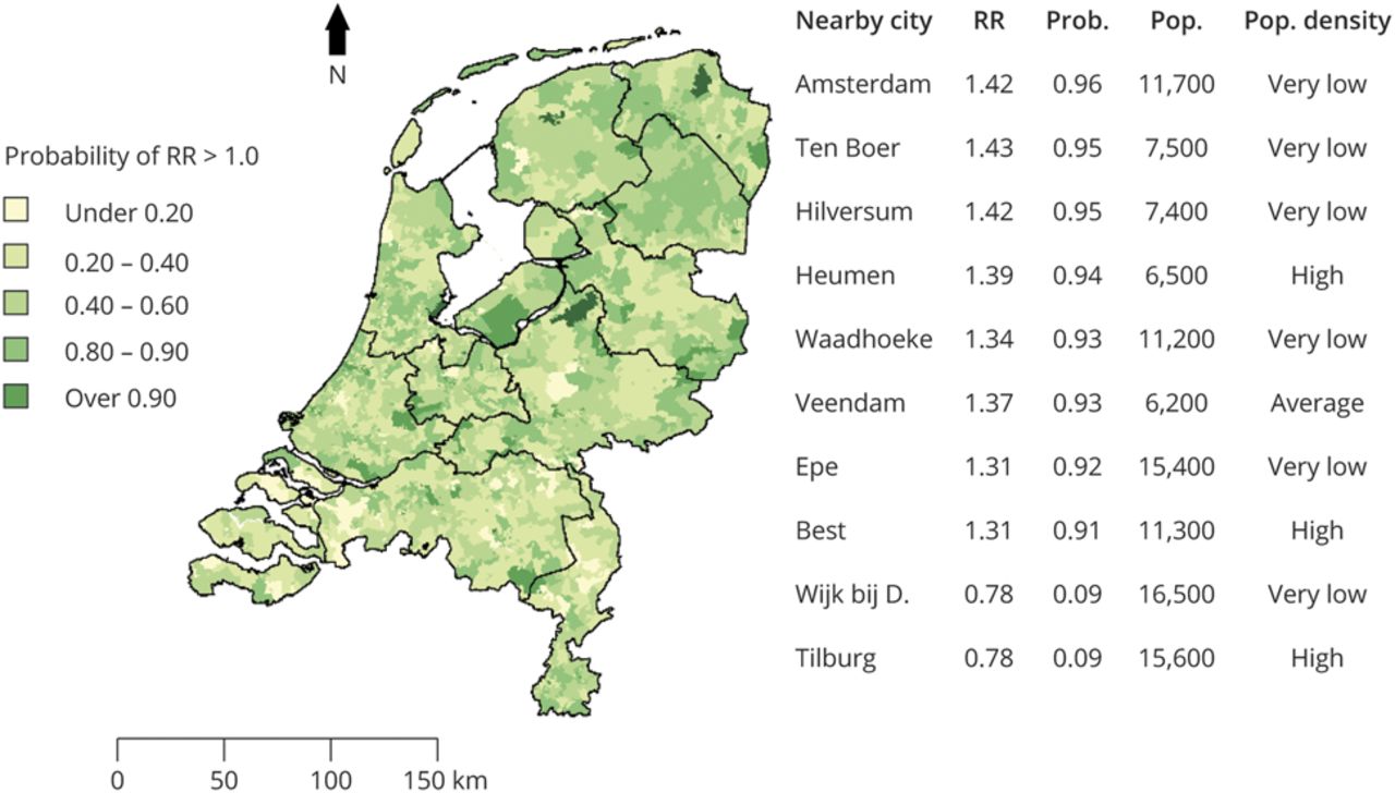 根据1998年至2017年荷兰个人记录数据库的数据,计算并平滑了1694个地区的运动神经元疾病(MND)相对风险。这张图显示了根据国家MND率,每个区域的MND相对风险(RR)大于预期的概率(Prob)(即,RR >1.0的概率基于后验分布的10,000次抽取)。人口(Pop)密度估计为每1公里的居民数量2;使用了荷兰统计局的以下定义:<500(非常低),500到1000(低),1000到1500(平均),1500到2500(高),> 2500(非常高)。Wijk bij D. = Wijk bij Duurstede。