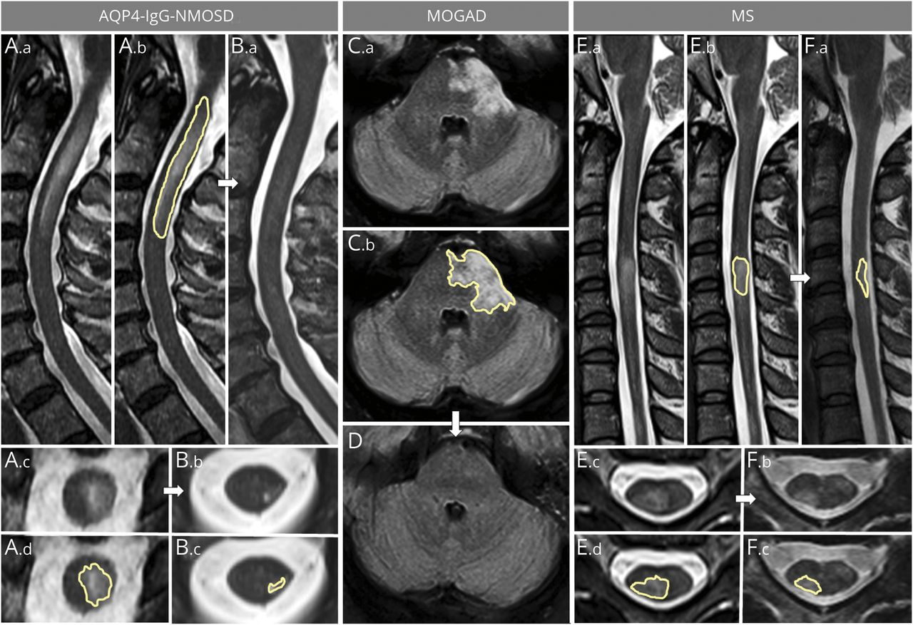 左边的图中显示矢状(的一部分。一个。b, b。a) and axial (A.c, B.b) T2-weighted images of a longitudinally extensive spinal cord lesion associated with aquaporin 4–immunoglobulin G–positive neuromyelitis optica spectrum disorder (AQP4-IgG-NMOSD) acutely (A) and at follow-up (B). The largest acute axial area of the lesion was manually outlined acutely on sagittal (A.b, yellow outline) and axial (A.d, yellow outline) images and at follow-up (B.c) to determine lesion resolution/reduction. In the center of the figure, an acute brainstem T2-hyperintense lesion associated with myelin oligodendrocyte glycoprotein–immunoglobulin G–associated disorder (MOGAD) is shown on axial fluid-attenuated inversion recovery images (C.a). The largest axial T2 lesion area manually outlined acutely (C.b, yellow outline) resolves to undetectable at follow-up MRI (D). On the right, a multiple sclerosis (MS) myelitis T2-hyperintense lesion is shown (E.a, E.b) with the largest area of the T2-hyperintense lesion outlined acutely on both sagittal (E.b, yellow outline) and axial (E.d, yellow outline) images. Despite being smaller acutely compared to the lesions associated with AQP4-IgG-NMOSD and MOGAD, the MS lesion only shows moderate reduction in size at follow-up, where it is still clearly visible on both sagittal (F.a, yellow outline) and axial (F.b, F.c, yellow outline) images.
