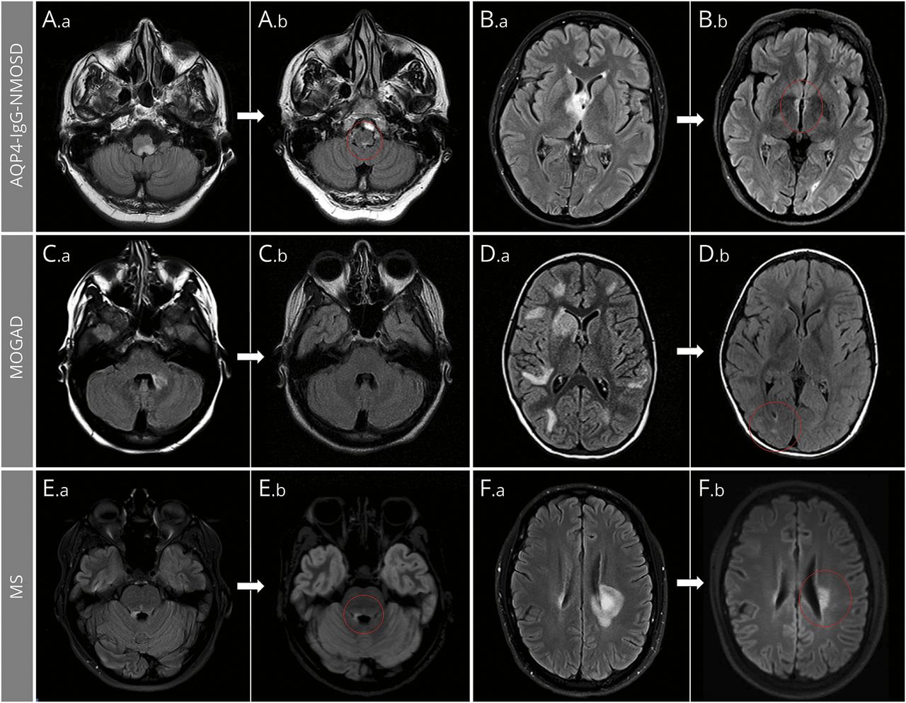 轴向fluid-attenuated反转恢复infratentorial (A, C, E)和幕上的(B, D, F)脑部MRI显示。AQP4-IgG-NMOSD患者(A、B),大急性病变。a、B。a) commonly show a prominent reduction of their initial size but rarely resolve completely, typically leaving tiny residual abnormalities (A.b, B.b; red circles). In patients with MOGAD (C, D), most large acute T2-hyperintense lesions (C.a, D.a) resolve to undetectable (C.b) at follow-up MRI, although some acute T2 lesions can leave some (often nonspecific) small foci of T2 hyperintensity (D.b; red circle). In patients with MS (E, F), acute T2-hyperintense lesions are relatively smaller (E.a, F.a) and typically show moderate reduction in size at follow-up, while remaining clearly detectable (E.b, F.b; red circles).