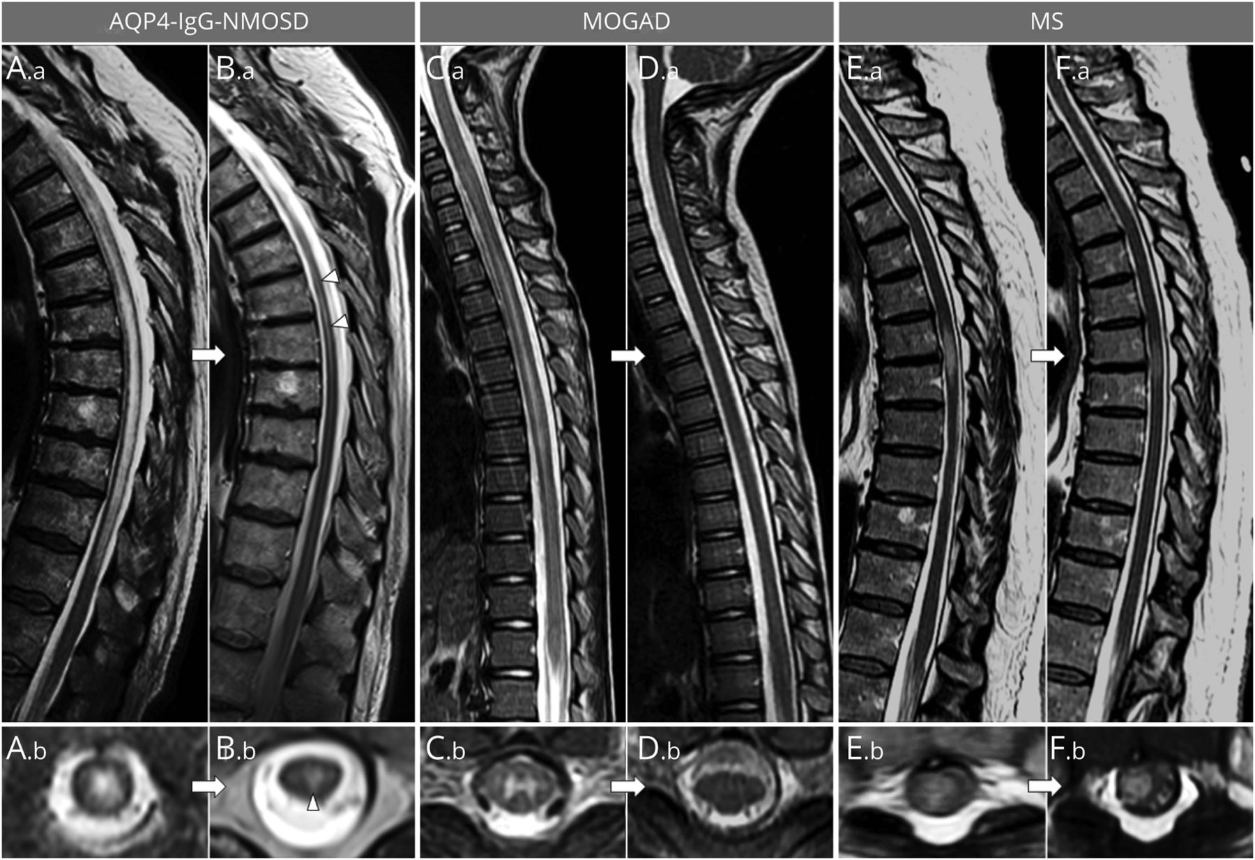 矢状(A。a、B。a, C。a, D。a, E。F。a) and axial (A.b, B.b, C.b, D.b, E.b, F.b) thoracic spinal cord T2-weighted images are shown. In patients with myelitis, T2-hyperintense lesions associated with AQP4-IgG-NMOSD, longitudinally extensive lesions with swelling of the spinal cord (A.a) and holocord involvement acutely (A.b [T7 vertebral body level]), frequently show a dramatic reduction in size at follow-up MRI but remain detectable, often accompanied by focal lesional spinal cord atrophy (B.a, B.b [T7 vertebral body level]). In patients with MOGAD myelitis, the acute ventral-predominant long T2 lesion extending to the conus (C.a) is gray matter restricted axially (C.b [T3 vertebral body level]) and resolved completely at follow-up MRI (D.a, D.b [T3 vertebral body level]). In patients with MS, the typically short acute myelitis T2-hyperintense lesion (E.a, E.b [T6-T7 vertebral body level]) often only has modest reduction in size at follow-up MRI (F.a, F.b [T6-T7 vertebral body level]), at which time it can be better appreciated to involve the periphery (right lateral columns) of the spinal cord on axial images (F.b [T6-T7 vertebral body level]).
