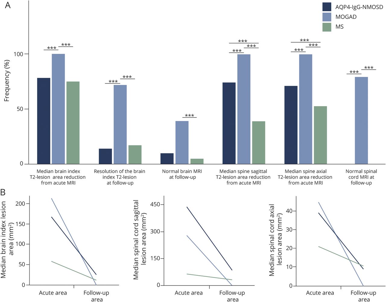 (A)条图显示了不同的频率分析措施的患者水通道蛋白4-immunoglobulin G-positive neuromyelitis视谱系障碍(AQP4-IgG-NMOSD)(深蓝色酒吧),髓少突细胞glycoprotein-immunoglobulin G-associated障碍(MOGAD)(浅蓝色酒吧)和多发性硬化症(MS)(绿酒吧)在大脑和脊髓。尽管规模最大的减少在AQP4-IgG-NMOSD和MOGAD病变有关,只有后者的MRI异常显示完整的决议后续在大多数情况下。相反,病灶显示的大小会减少最小的女士在随访,类似于AQP4-IgG-NMOSD病变,不太可能完全解决。两组统计学意义差异由星号表示的酒吧(* * *)。(B)中位数为大脑和脊髓损伤轴向最大的区域,并为脊髓矢状,敏锐,MRI随访3组。确切的p所示值不同的比较表2和3。
