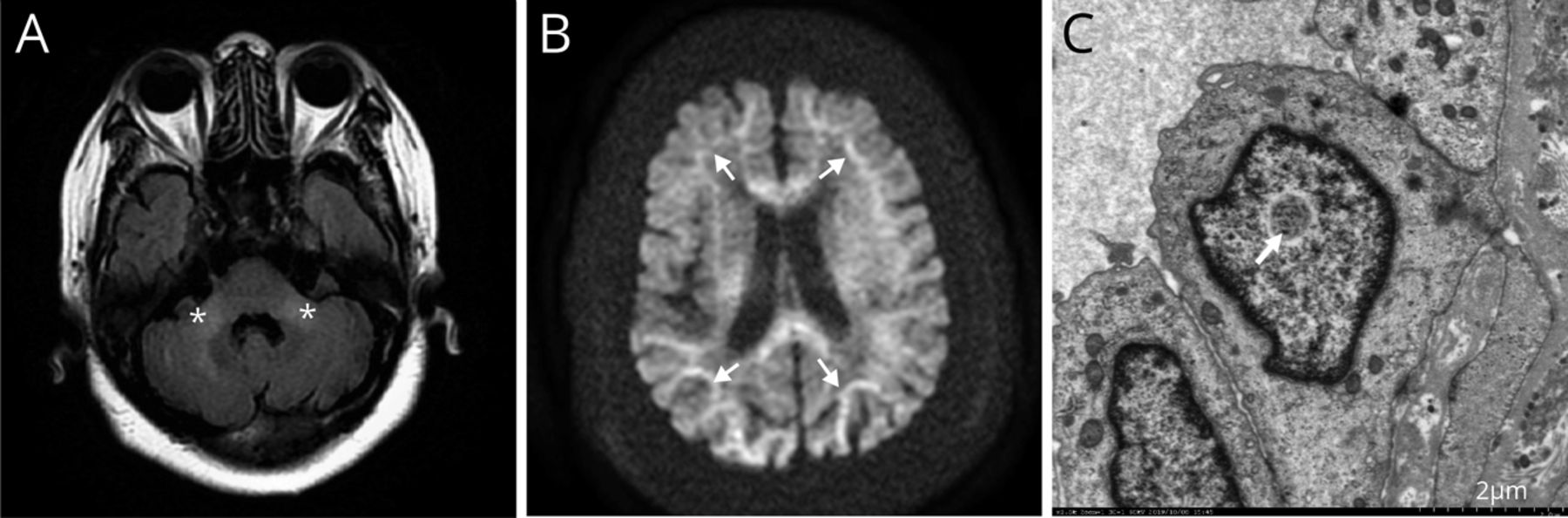 脑MRI显示双侧小脑中梗液体衰减反转恢复序列(A,星号)及皮质髓质交界处和胼胝体扩散加权序列(B,箭头)高。(C)皮肤活检显示汗腺细胞核内包体(箭头)。