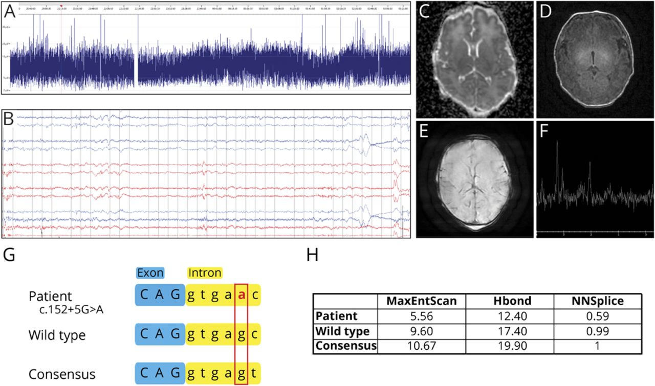 (一)Amplitude-integrated脑电图显示一个不连续的背景与减毒电压但没有发作。(B)完整的双相蒙太奇脑电图显示不连续interburst间隔约为8秒,但没有痫性放电或癫痫发作。脑电图进行,病人接受0.01毫克/公斤/小时吗啡。(氟)轴向部分从病人的脑部MRI显示正常的ADC图(C)没有急性损伤的证据,一个正常的t1加权序列(D)没有损伤或结构畸形的证据,和正常susceptibility-weighted序列(E)没有证据表明颅内出血。先生(F)病人的基底神经节的光谱采样显示没有异常的峰值显示急性损伤或代谢紊乱。(G)原理图展示的序列变异与野生型相比我们的病人和共识序列拼接网站。152 + 5 G >的一个变种是包含在5′拼接网站共有序列编码在核苷酸5 G→A颠换从插入开始网站(大胆的红色字体)。野生型序列是最常见的等位基因在健康人群中找到。规范的共识序列是一个强大的变异序列MAG | GURAGU, M是腺嘌呤、胞嘧啶和R是一个嘌呤。(H)汇总数据的计算机模型用来预测病人的接头强度的网站:MaxEntScan使用最大熵原理来分接头的强度。 HBond calculates the number of hydrogen bonds formed between the splice site and the U1 snRNA. NNSplice is a neural network trained on established consensus splice sites. In all cases, a higher score indicates a stronger potential splice site, and in all cases, the patient's genetic variant scored substantially lower than the wild-type or consensus sequences. These models have been previously validated as robust predictors of cryptic splicing12并免费提供给公众。