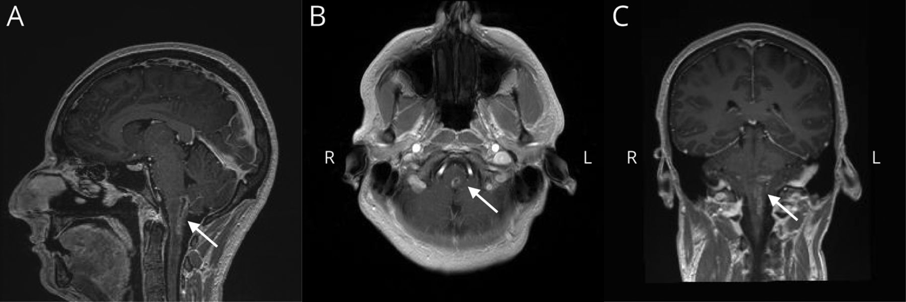 最初的头部CT是正常的。颈部CT对比显示左声带麻痹;耳朵、鼻子和喉咙声带评估确认完整的离开真的不动。腰椎穿刺最初显示460个有核细胞与淋巴细胞优势(79%),蛋白质68 mg / dL,葡萄糖72 mg / dL。meningitis-encephalitis PCR面板是负数,细菌和真菌的文化。核磁共振成像的大脑和颈椎有或没有对比显示一个扩大的,波形的,rim-enhancing病变在左背侧髓质扩展劣等C2-C3水平(图)。