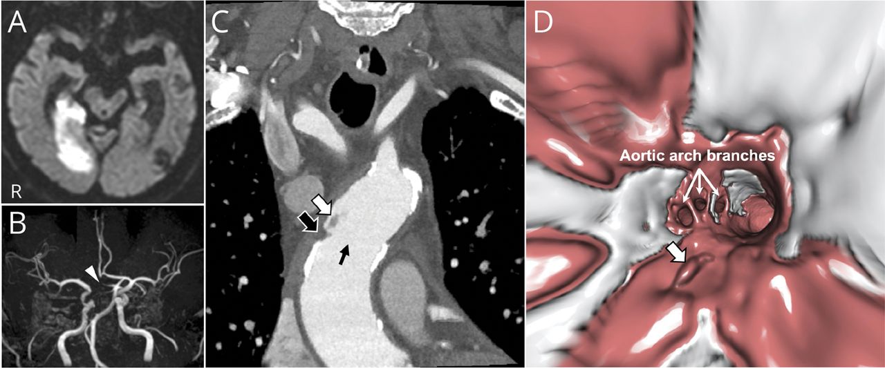 一个80岁的人开发了一个急性缺血性中风和右大脑后动脉(PCA)闭塞(图中,A和B)。心脏和颈动脉超声检查和24小时心电图监测没有确定任何栓子来源。ECG-gated 4 d CT血管造影(CTA)显示noncalcified斑叠加移动组件升主动脉(图中,C,视频1)。使用数据集从虚拟angioscopy ECG-gated 4 d CTA显示seaweed-like移动组件在三维视图中(图D,视频1)。这是诊断为aortogenic栓塞。华法林的抗凝治疗是由氯吡格雷国际标准化比率为2.0 - -3.0,和低密度脂蛋白胆固醇水平控制在低于70 mg / dL伐。