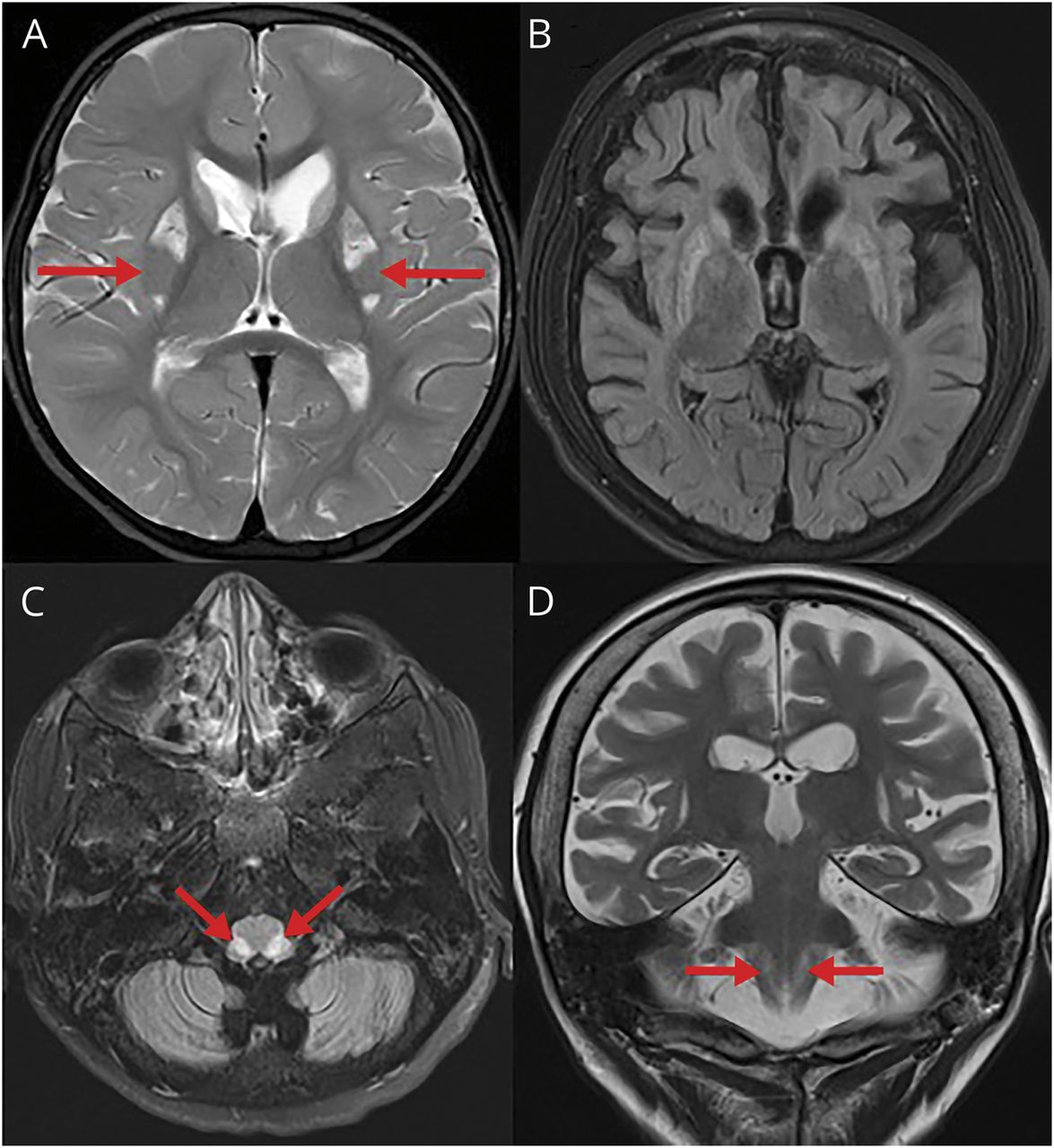 2岁大脑核磁共振显示了典型的“putaminal眼”(A,箭头)。MRI在7岁显示进步的萎缩和胶质增生的基底神经节和大脑皮层萎缩(B)和双边对称信号变化的核束solitarius液体衰减反转恢复序列在t2加权像(C,箭头)和(D,箭头)。