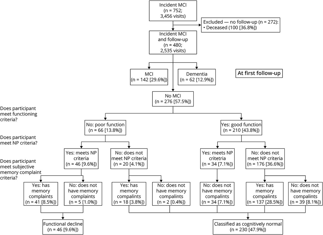 在至少随访1次的480例MCI病例中,62例(12.9%)在随访时进展为痴呆,142例(29.6%)继续符合MCI标准(即持续MCI诊断),即存在主观记忆障碍和客观认知障碍,但保留了日常功能,未诊断为痴呆。其余276名(57.5%)受试者在下一次随访时未完全符合MCI标准。然而,这276名参与者中有66人(24%)出现了功能障碍,排除了轻度认知障碍的考虑,这66人中还有46人继续存在客观认知障碍。由于功能障碍,这些参与者(9.6%)不符合MCI的算法标准,但他们也不符合痴呆症的临床标准。这些参与者被归类为功能衰退。其余230名参与者(47.9%)由没有痴呆症的参与者组成,他们只有主观抱怨,只有客观认知障碍,只有没有功能障碍,或这3个标准中的2个标准的组合,但不是所有3个标准。图2提供符合或不符合不同标准的参与者数量的细目。