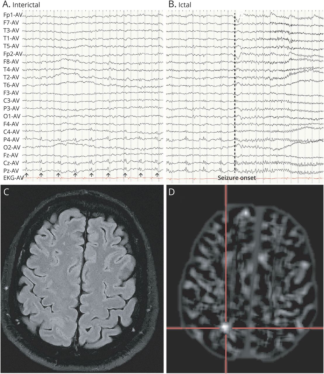 病人接受了高分辨率磁共振成像(eFigure 1,得了,links.lww.com/WNL/B790)和发作的宠物,这两个报告正常。三天的video-EEG监测捕获超过20集焦发作从10到30秒。癫痫发作引起或加剧了左脚的自愿抓挠。符号学是光环提供的感官杰克逊3月在他的左边,有时跟着主音左侧肢体的姿态。病人意识到整个攻击。卡马西平的逐渐减少,2集FBTCSs被捕,之前都是无意识的睡眠时腿部运动。