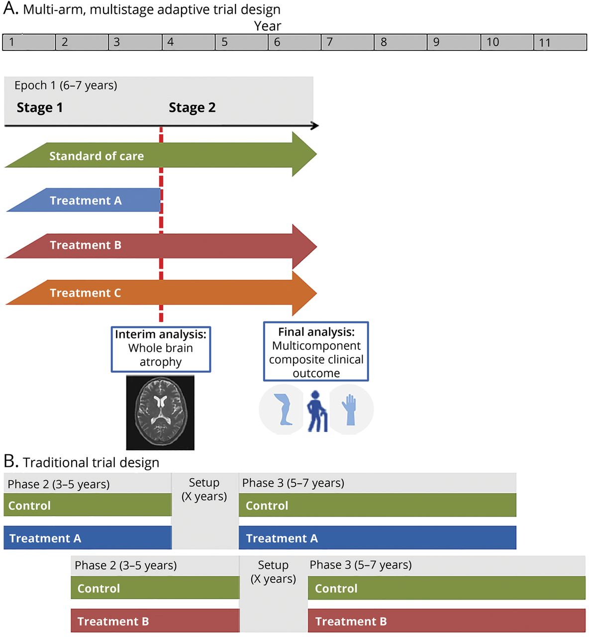 一个可能的途径是提高效率的试验中加入自适应元素多臂机多级(播出)平台设计。播出的试验旨在评估多个实验武器和无缝集成到一个传统的第二和第三阶段评估试验。他们已经成功地加快评估其他疾病的治疗和改变实践设置,比如癌症7和传染病。8他们也越来越多地考虑神经系统疾病如阿尔茨海默病,9帕金森病10和运动神经元疾病。11,12这些神经退行性条件与项目经理分享共同点,哪里有明显转化差距源于早期阶段试验的相对丰度增加理解疾病的病理学和缺乏积极的III期试验导致疾病修饰治疗。