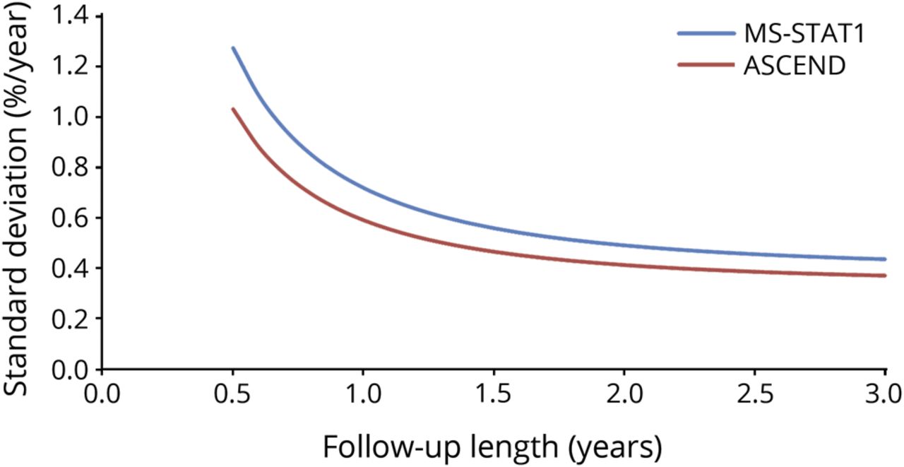 应用我们的统计模型的基础上预测了SDs (eAppendix 1,links.lww.com/WNL/B900从MS-STAT1)数据并提升所示图2。SD预计后续随长度增加而迅速降低,尤其是在头12个月。18 - 24个月后,减少的SD变得小得多。