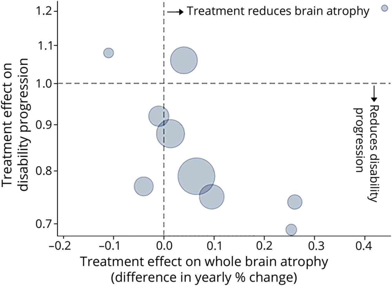第一阶段的结果的关键标准是能够识别治疗无效,也可能有效的最后(阶段2)的结果。我们回顾了两脑萎缩速率试验报告治疗效果和临床进展。试验结果发表在eAppendix 2 (links.lww.com/WNL/B900)和总结图3。有负相关,表明药物和更强的影响减少脑萎缩在经前综合症更有效的临床结果,在名RRMS确认结果。26