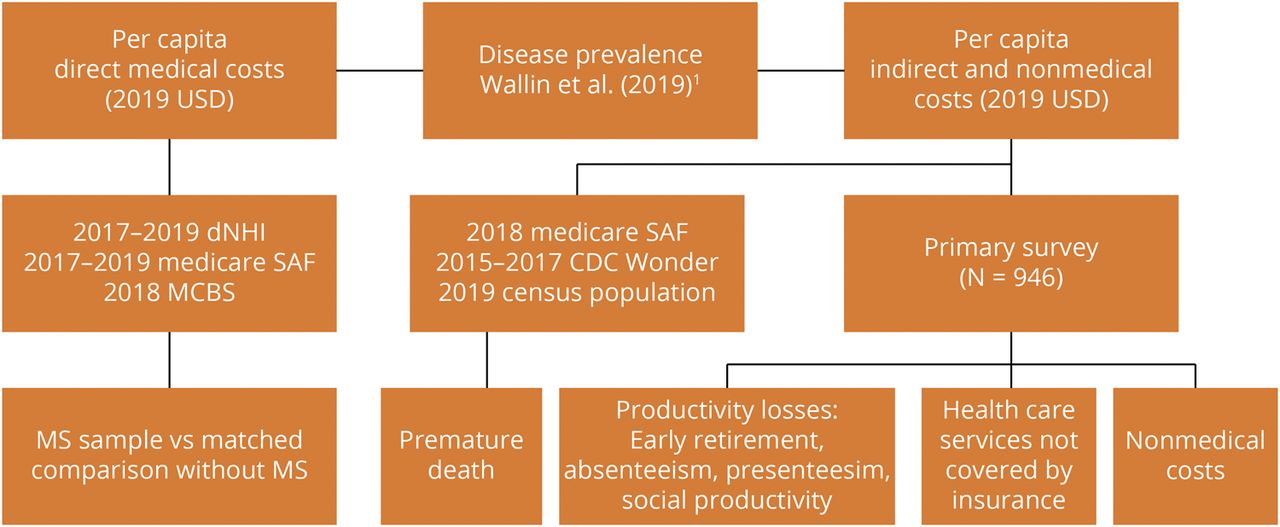 我们依靠各种主要和次要的数据源来估计不同组件的女士的成本,包括现有的全国性调查数据,公共和私人索赔数据,国家死亡记录,进行自行调查(图1)。我们依靠流行女士估计为2010,在2019年发表在《文学。1获得2019 MS的估计,我们使用策略所描述的MS患病率工作组1和应用每年2.3%的增长率在2010年估计。