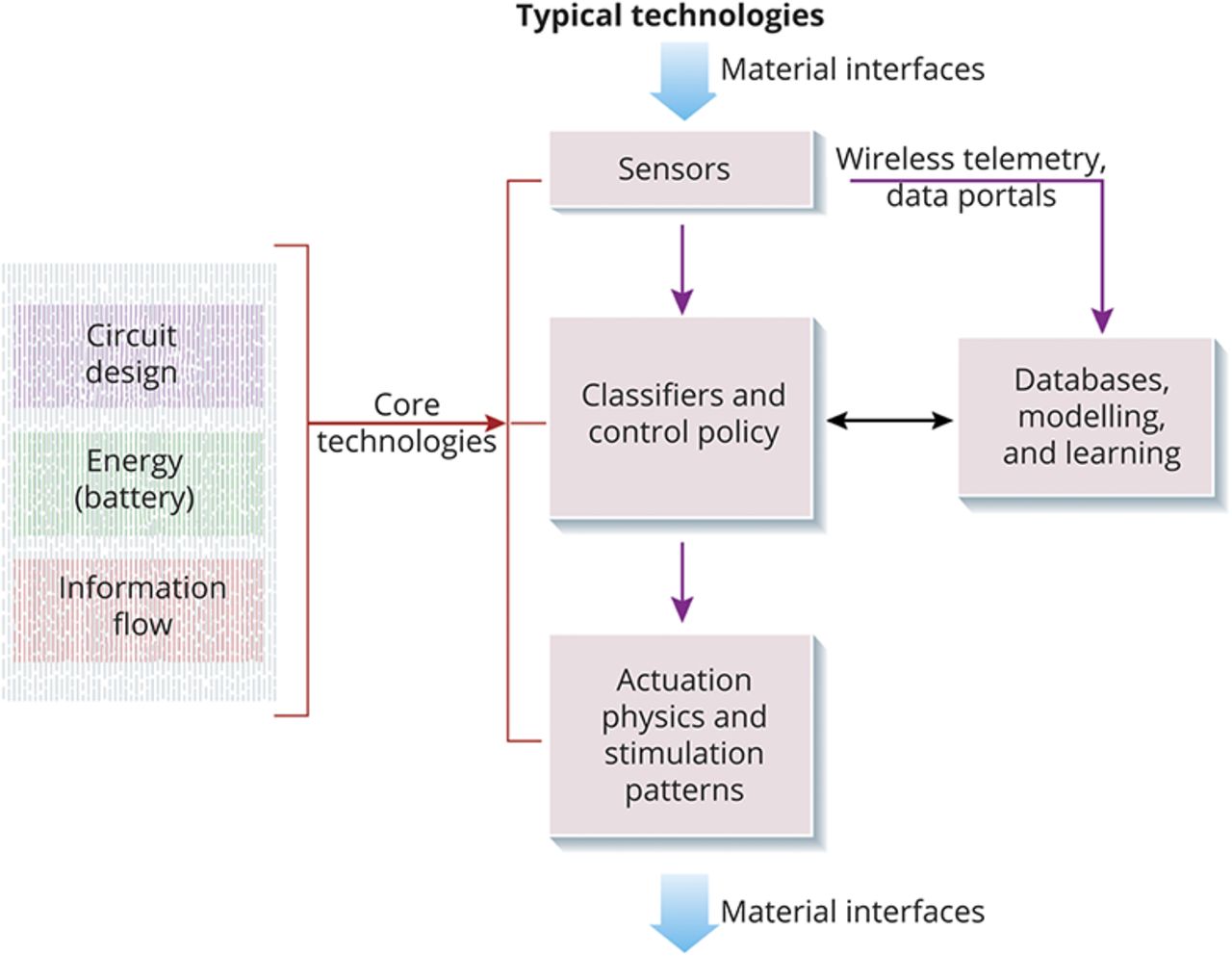 该系统通过物质界面与神经系统相互作用,以感知生理信号和刺激。传感器可以包括电活动的直接测量或替代品,如惯性信号。这些信号可以用来估计病人的状态,然后控制策略决定应该对刺激模式进行哪些调整。闭环系统由数据库、建模和机器学习支持,以优化性能;数据收集需要额外的遥测和数据存储基础设施。电路设计、储能、信息等核心技术是很多堆叠设计的共性。