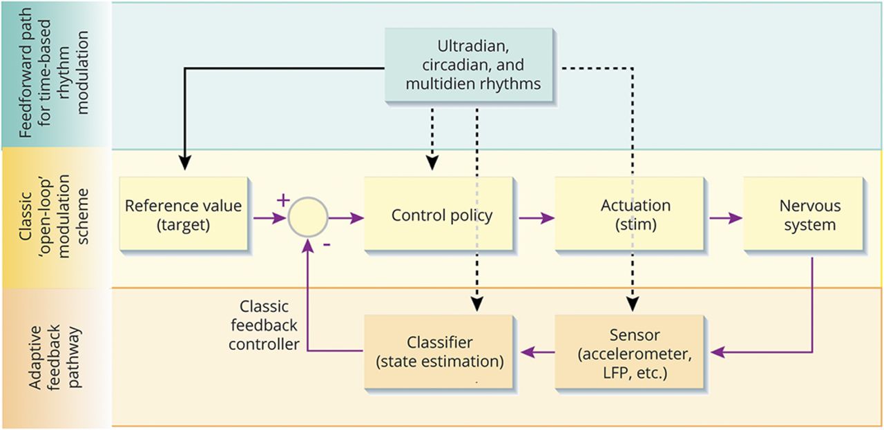 刺激也可以根据基于时间的生物节律进行调整。目前正在对癫痫患者进行研究,以了解如何根据个人的昼夜/日和多日癫痫发作节律调整反应性刺激,并预测更大的癫痫易感性时间。30.,31类似的努力试图根据患者的睡眠-觉醒周期来调整运动障碍的日刺激。在未来,如在地图上图3该设备中的算法将结合对刺激模式的昼夜前馈调整和短时间响应模式,就像调节生理机能的自然控制机制一样。32