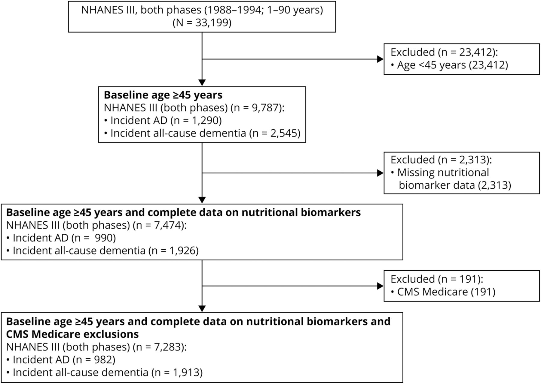 来自第三次全国健康和营养检查调查(NHANES III)的参与者包括通过复杂的多阶段概率样本设计获得的美国平民非机构人口的代表性横断面样本。在1988年至1994年期间,参与者接受了家庭访谈和体检,包括采血。9NHANES与几个行政数据库相关联,包括医疗保险和医疗补助服务中心(CMS)和国家死亡指数(NDI)。有关这些连接程序的详细信息载于eMethods 1 (links.lww.com/WNL/B921).