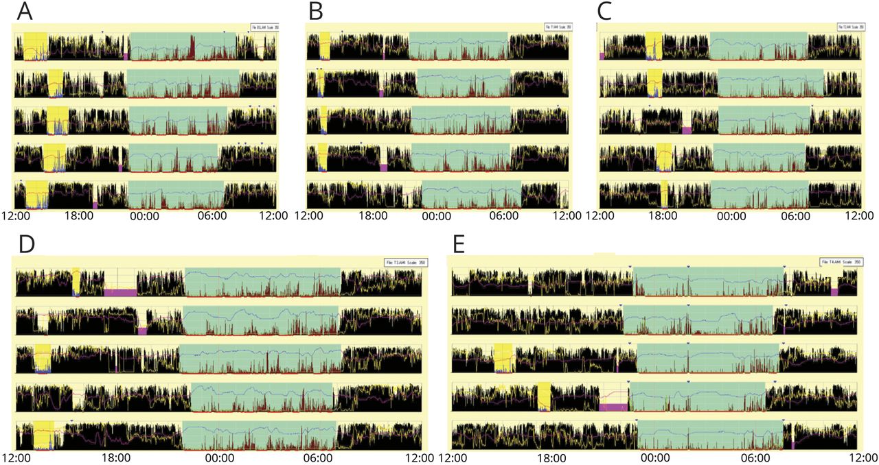 每个面板显示五天的窗口。黑条代表手腕活动记录仪检测到的运动;没有黑条表示睡眠时间。水平线表示连续的24小时周期,x轴表示时钟小时数。天蓝色高光=夜间睡眠时期。黄色高亮部分=白天睡眠。紫红色高亮=设备移除的周期。诊断前(A),活动记录仪描述了NT1患儿的24小时特征。在3个月和6个月的随访中,活动记录仪显示白天睡眠时间逐渐自发减少,同时夜间运动活动强度降低(B和C)。在9个月的随访中(D, pitolisant 18 mg/ D稳定治疗),活动记录仪记录了白天睡眠发作的进一步减少,以及主观嗜睡和猝厥的改善。在12个月的随访中,添加SO,活动记录仪(E)记录了夜间睡眠效率的显著改善和夜间睡眠时间的缩短,与之相对应的是午睡频率的减少。