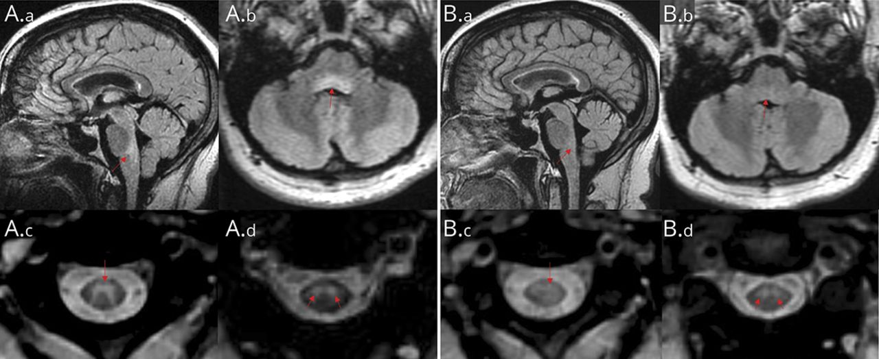 矢状位(A.a)和轴向(A.b) T2/液体衰减反转恢复(FLAIR)和轴向T2加权成像上颈脊髓C2 (A.c)和C2- c3 (A.d)中心灰质T2高信号(箭头)。1个月后,C2 (B.c)和C2-3 (B.d)水平脑干(B.a, B.b)和上颈髓t2高强度不明显。钆给药后t1加权成像无增强,扩散加权成像(DWI)及表观扩散系数(ADC)图像无扩散受限(未显示)。
