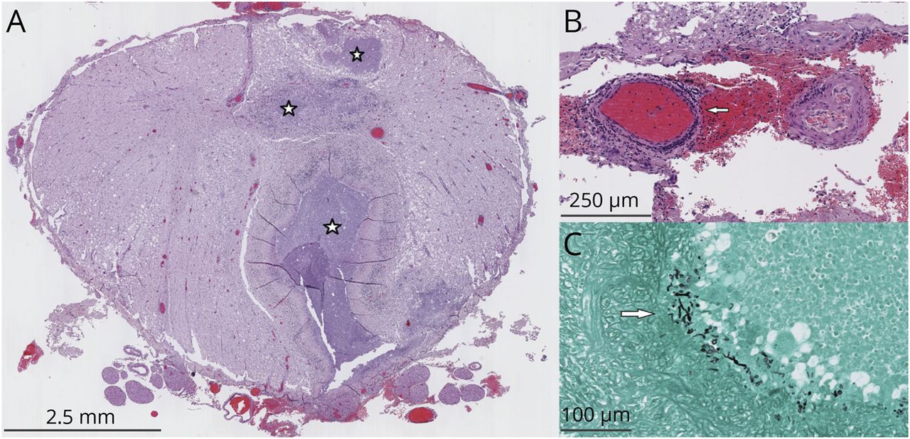 一个55岁的男人,没有病史除了复发性皮肤糠疹杂色的与无热的感染,出现在急诊暴力腹痛后进行为期4天的亚急性排尿困难和下肢轻瘫。常规生物学测试和腰椎CT扫描稀松平常的。他承认神经内科3天后截瘫和剧烈的腰痛。首页与钆增强脊髓MRI显示LETM T4和T6 (图1中,A和B)与颈段肿胀扩展。脑部核磁共振成像显示一个小lateroventricular特异性的,nonenhancing白质hyperintensity,没有中央静脉的迹象。第一腰椎穿刺显示中度淋巴细胞脑脊液细胞增多(28 /μL),蛋白质为1.48 g / L,正常glycorrhachia。一个广泛的传染病检查包括下一代测序传染性病原体的CSF是负面的。没有任何证据表明肺结核或自身免疫系统疾病,和anti-myeline少突细胞糖蛋白和anti-aquaporin 4抗体呈阴性。炎症性脊髓炎被怀疑,10类固醇的周期脉冲和4 plasmaphereses开始了最初的神经功能改善。三周后发病,症状恶化与提升的感觉在C4水平。脊柱MRI显示一个扩展的骨髓炎延髓(图未显示)。主要的假设是过早复发的类固醇治疗,和甲强龙重新在240毫克。星期4,病人出现发烧反复无菌血培养:第二腰椎穿刺获取8000中性粒细胞/μL与蛋白质在6.73 g / L。 Beta-D-glucan was positive in the serum at 496 pg/mL but was not tested in the CSF. CSF culture was positive for白色念珠菌,然后介绍了伏立康唑6 4毫克/公斤/ 12 h,头孢噻肟和阿莫西林。因为怀疑免疫缺陷,antituberculous quadritherapy方案(利福平、异烟肼、乙胺丁醇、吡嗪酰胺)添加,因为合并感染频繁在免疫功能低下的患者,我们寻找先天性免疫力。基因小组测序(Inne面板,扭曲;见eAppendix 1,links.lww.com/WNL/C176发现了一个纯合子的更多信息)CARD9变体c。865C>T (p.Gln289*), which is a known disease-causing variant.2此时,二次感染血管炎被怀疑当大脑MRI显示动脉和小脑脚上的梗死(违规行为图1 c)。伏立康唑取代1周后脂质体两性霉素B,因为与利福平导致残余伏立康唑的检测水平;白色念珠菌CSF仍可检测到。在第6周出现症状,改变意识和大脑成像显示脑室出血。病人被转移到重症监护室,每天监测颅内压增加。脑动脉造影术发现后下小脑动脉的动脉瘤(图1 d),这是脾栓塞在同一过程。症状恶化,回流的经颅多普勒是紧随其后的是脑死亡。尸体剖检没有发现证据传播extraneurological念珠菌病。髓质组织病理分析显示大坏死病变(图2中,A和B与众多有隔膜的假菌丝,苏木精和伊红染色)和真菌孢子在边界(图2 c格罗克特染色)。有强烈的动脉壁炎症浸润,表明动脉炎。病人的家属收到样本CARD9不足,和遗传咨询正在进行。迄今为止,只有杂合的变化诊断在家庭,也没有家族病史真菌感染的报道。