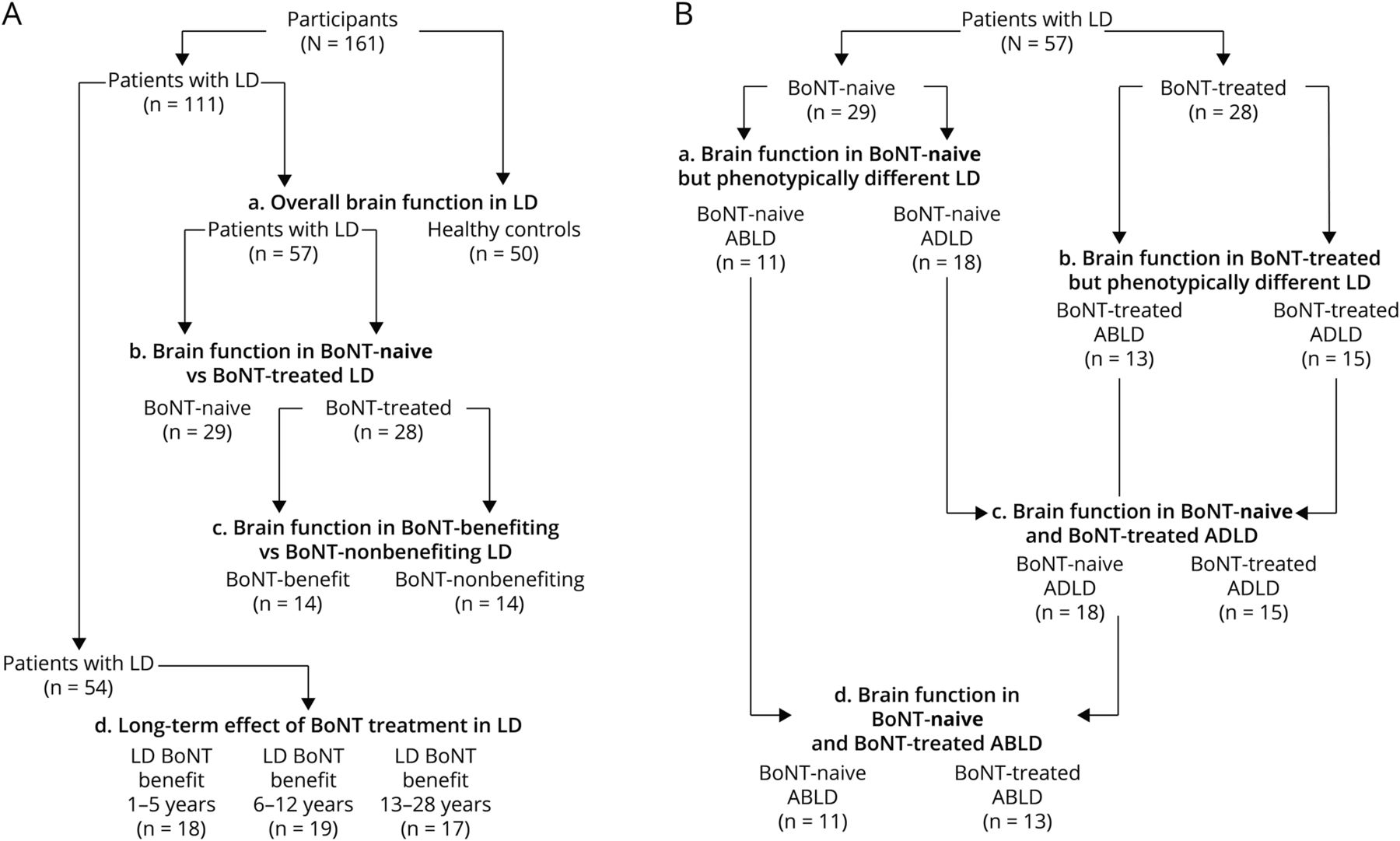 鉴于明显更大的好处比ABLD ADLD肉毒毒素治疗的患者,3第二个研究调查了短期中央肉毒毒素注射依赖LD表型的影响。患者分组如下(图2 b,表1):
