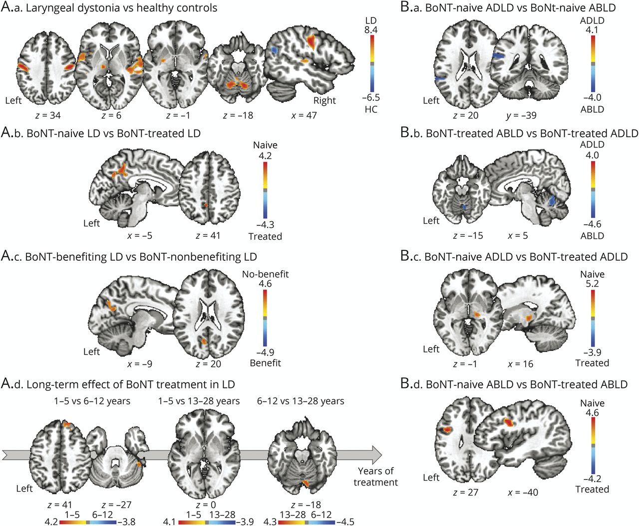 (A)在统计上有显著差异的大脑活动在语言产生所示(一个)一个聚合组之间患者LD和高碳钢(FWE-correctedp≤0.05,最低voxelwise阈值p≤0.00001和集群大小≥343毫米3),(b) BoNT-naive BoNT-treated LD (FWE-corrected患者p≤0.05,最低voxelwise阈值p≤0.01和集群大小≥1715毫米3),(c)患者LD有或没有受益于肉毒毒素治疗(整个大脑voxelwise-correctedp≤0.01≥最小集群大小的858毫米3),(d)肉毒毒素治疗的长期效果在接受注射的病人中1 - 28年(整个大脑voxelwise-correctedp≤0.01≥最小集群大小的858毫米3)。(B)在表型上分层组织,在统计上有显著差异的大脑活动在(a)之间的言语生成显示BoNT-naive ADLD ABLD患者,患者(B) BoNT-treated ADLD ABLD患者,患者(c) BoNT-naive ADLD患者和治疗,和(d) BoNT-naive ABLD患者治疗。统计学意义是设定在整个大脑voxelwise-correctedp≤0.01,最小集群大小≥858毫米3。脑片所示AFNI标准Talairach-Tournoux空间。彩色条纹代表t分数。ABLD =外展LD型;ADLD =收肌LD型;肉毒毒素=肉毒神经毒素;FWE = family-wise错误;LD =喉肌张力障碍。