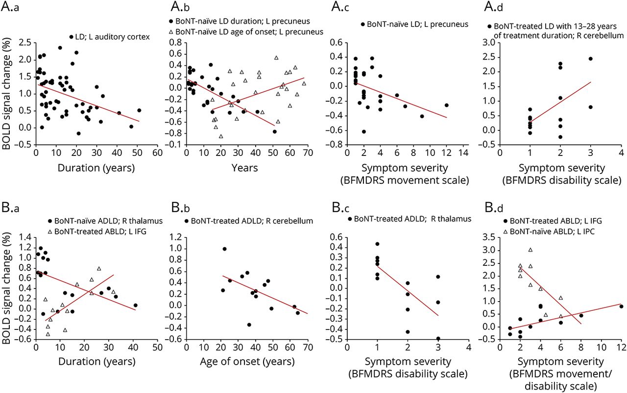 (一)散点图显示显著区域意味着大胆信号百分比变化之间的相关性和(A)障碍持续时间LD,患者(b)的持续时间和年龄障碍发病患者BoNT-naive LD, (c)在BoNT-naive LD患者症状严重程度,和(d)症状严重性BoNT-treated LD 13-28年患者治疗的持续时间。(B)散点图描述之间存在明显的数据上的相关区域的意思是大胆的信号变化和百分比(a)障碍持续时间在BoNT-naive ADLD患者和BoNT-treated ABLD, (B)在BoNT-treated ADLD患者发病年龄障碍,(c)在BoNT-treated ADLD患者症状严重程度和症状(d)严重程度患者BoNT-naive ABLD和BoNT-treated ABLD患者。统计学意义是设定在整个大脑voxelwise-correctedp≤0.05,最小集群大小≥214毫米3和R年代≥0.40±。ABLD =外展LD型;ADLD =收肌LD型;BFMDRS = Burke-Fahn-Marsden肌张力障碍评定量表;肉毒毒素=肉毒神经毒素;LD =喉肌张力障碍。