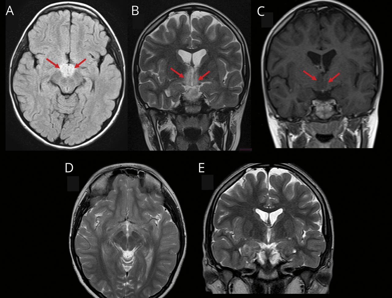 症状2周后的脑MRI, (A)轴向液体衰减反转恢复成像和(B)冠状位t2加权图像显示双侧下丘脑高强度非强化病变(C)(箭头)。(D)和(E) t2加权图像显示诊断和治疗3个月后病变的分辨率。